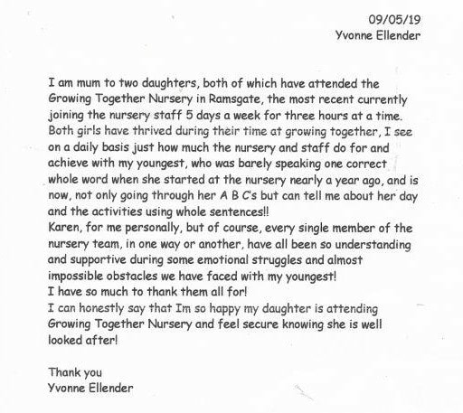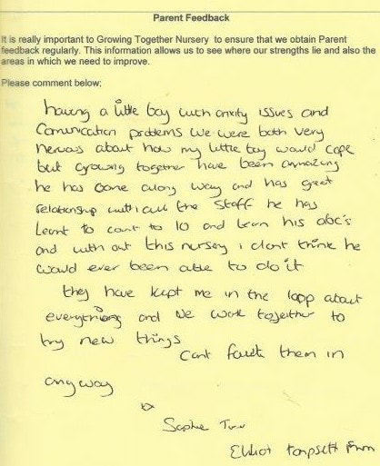 Sarah Leigh - February 2024I personally couldn't have chosen a better nursery to send my daughter too. Growing Together have remained open during this pandemic whenever the government have allowed. They will continue to do so, always with a smile on their faces.